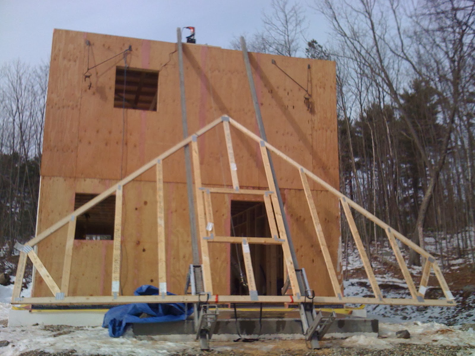 Below is video of Jake's amazing contraption that he used to bring the roof trusses and other material up to the roof by himself.